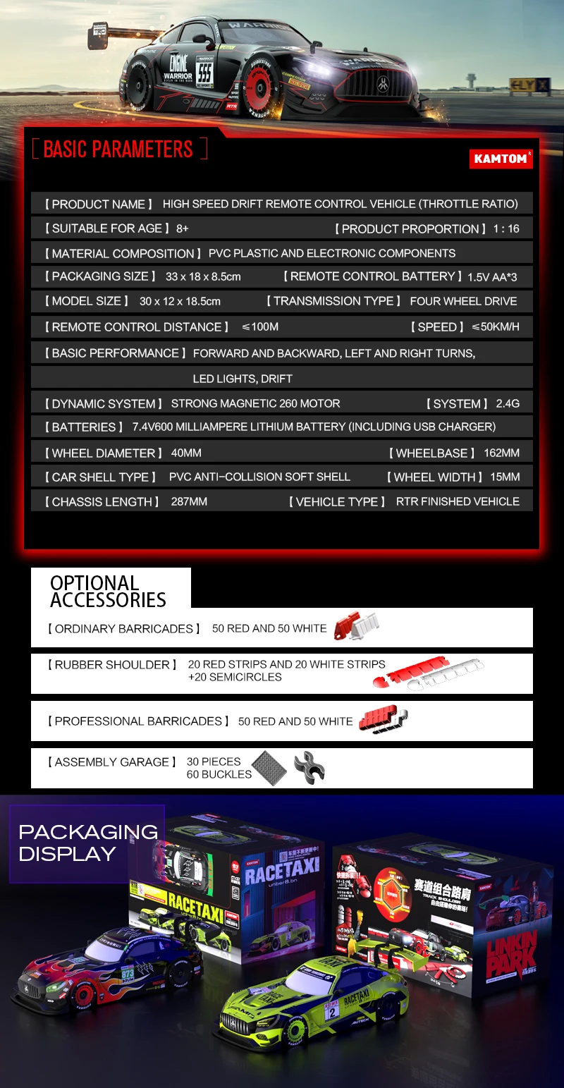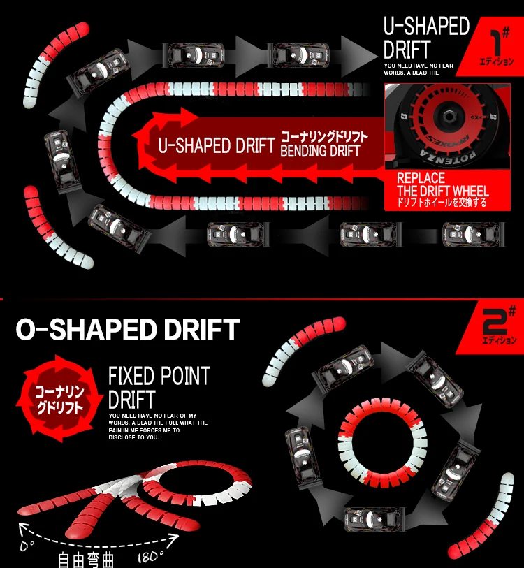 2 sets of tires+2 sets of Tail+ 4-wheel drive +two Motor drive+Optional modification accessories+U-shaped bending drift+ Professional racing track+Linkage lights